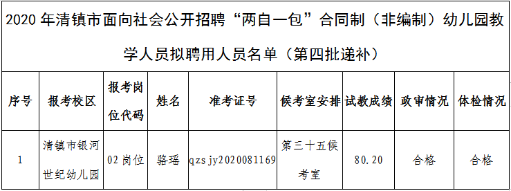 根據(jù)《清鎮(zhèn)市面向社會(huì)公開招聘“兩自一包”合同制(非編制)幼兒園教學(xué)人員公告》相關(guān)程序,現(xiàn)將第四批遞補(bǔ)(共1名)考核政審合格擬聘用人員予以公示。