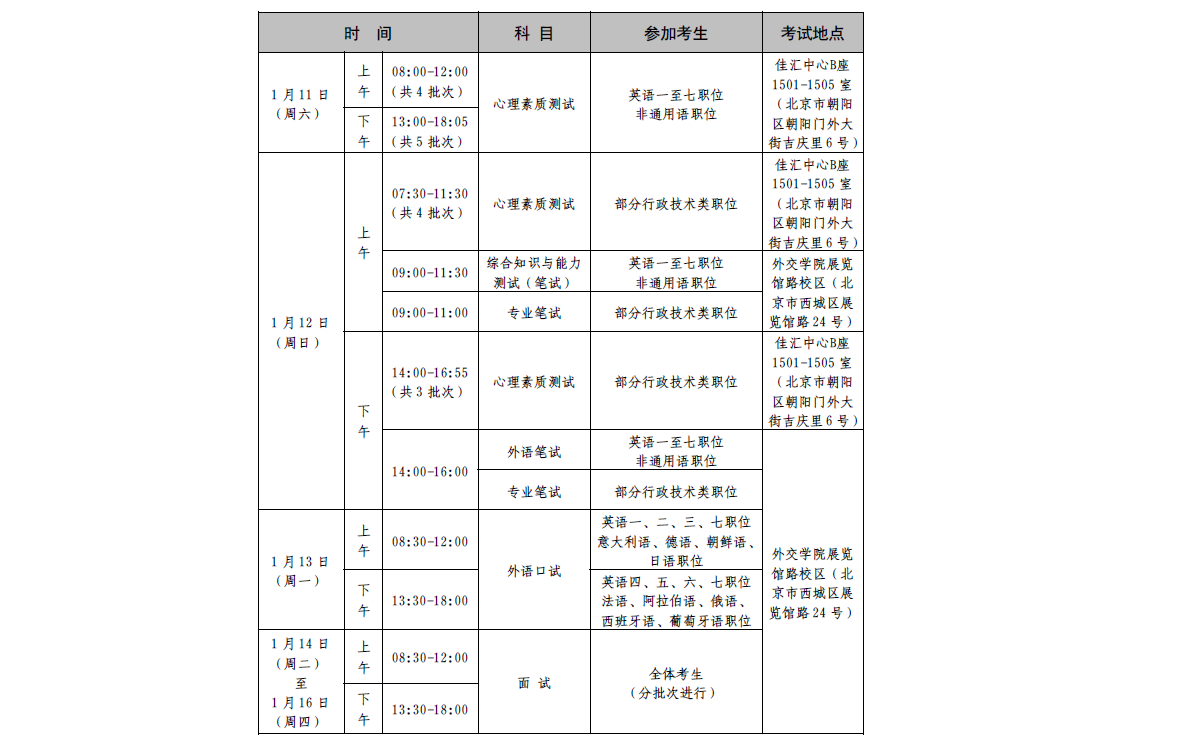 外交部2020年度考試錄用公務(wù)員專業(yè)能力測試和面試定于2020年1月12日至16日在北京集中舉行,并于1月11日至12日分批次進行心理素質(zhì)測試。根據(jù)中央公務(wù)員主管部門2020年度考試錄用公務(wù)員工作安排,現(xiàn)將有關(guān)事項公告如下: